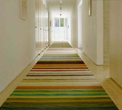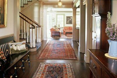 راهروها را لزوما با فرش پر نکنید، برای پوشاندن راهروها میتوانید از فرشهای کناره ای زیبا متناسب با عرض راهروتان استفاده کنید و اجازه دهید از کناره ها کف پوش پیدا باشد. این هال نمونه زیبایی از نکته نهم نکات مهم در فرش پهن کردن برای دکوراسیون است.