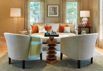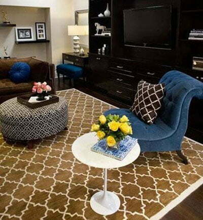 اگر به استفاده از قالیچه های کوچک با طرح های بولد تمایل دارید، بهتر است صندلی یا مبلمان را در اطراف قالیچه و کناره ها ( فرش شکل بیضی یا دایره ای ) بچینید و هیچ کدام از پایه های آنها روی فرش نباشد. این کار باعث می شود تا قالیچه و کناره ها ( فرش شکل بیضی یا دایره ای ) بیشتر خودنمایی کند.